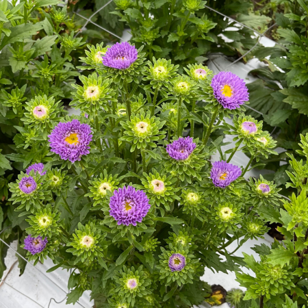 know.花では、アスターがお盆の時期に最も美しく咲くように、3月に播種を行い、生育ステージを見ながら定植時期をずらしていきます。