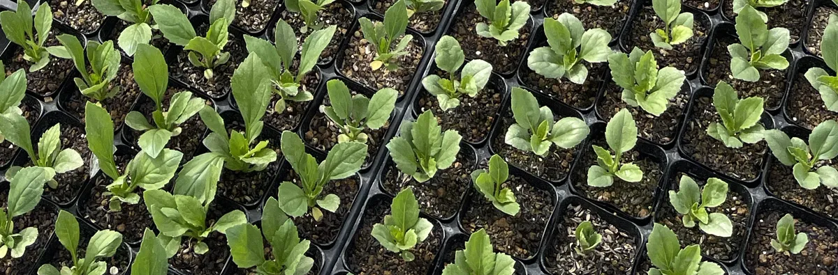 アスターやニゲラなどの一年草の苗づくりに加え、バジルや青じそといったハーブ類の苗も育てています。